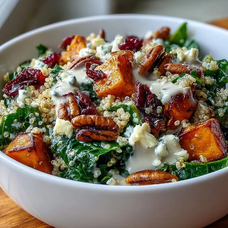 Every element here plays a specific role—the warm quinoa and roasted sweet potato ground the bowl, the massaged kale adds earthiness and nutrition, the pecans and cranberries bring texture and tartness, and the blue cheese adds a sophisticated edge that makes it feel special. The tahini dressing ties it all together with warmth and creaminess, while the lemon juice keeps everything bright and prevents the bowl from feeling heavy. It's a balance that comes together without being fussy.