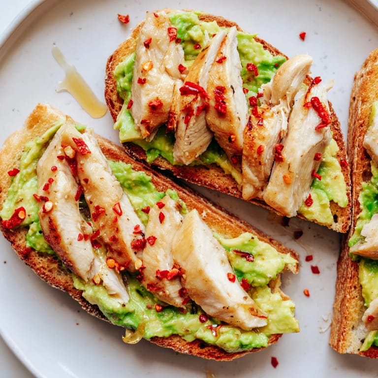 - Spread the smashed avocado evenly over each slice of toast, then layer the sliced chicken on top. Finish with a sprinkle of chili flakes and a generous drizzle of honey.